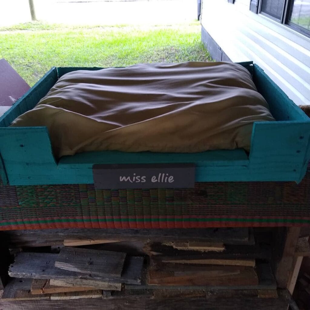 To recreate this, grab a standard 40×48 pallet, sand it smooth, and cut it down so the side rails sit about 6 inches high. Paint it with exterior-grade teal paint — it holds up against wet paws. For the cushion, a military-canvas duvet cover over a 4-inch foam insert gives that full, plush look. Add a small chalkboard label to the front for her name.
