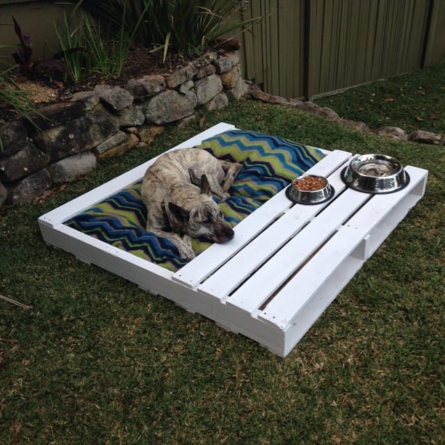 To recreate this, grab a standard 48″ x 40″ shipping pallet and sand it smooth. Paint it with exterior white latex paint — two coats keep it from chipping when your golden’s nails drag across it. Nestle in a waterproof outdoor cushion that fits the pallet’s inner frame. For the bowl station, cut two 6-inch circular holes on one end and drop in stainless steel bowls.
