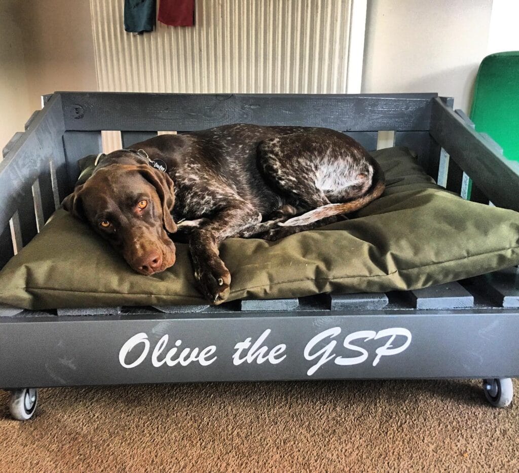 Olive’s bed is a gray-painted wooden pallet framed into a box shape, raised on four swivel casters so you can roll it room to room without waking her. The cushion is a double-stacked olive green canvas pad — durable, wipe-clean, and thick enough that your dog actually stays on it instead of sliding off onto the floor at 2am.