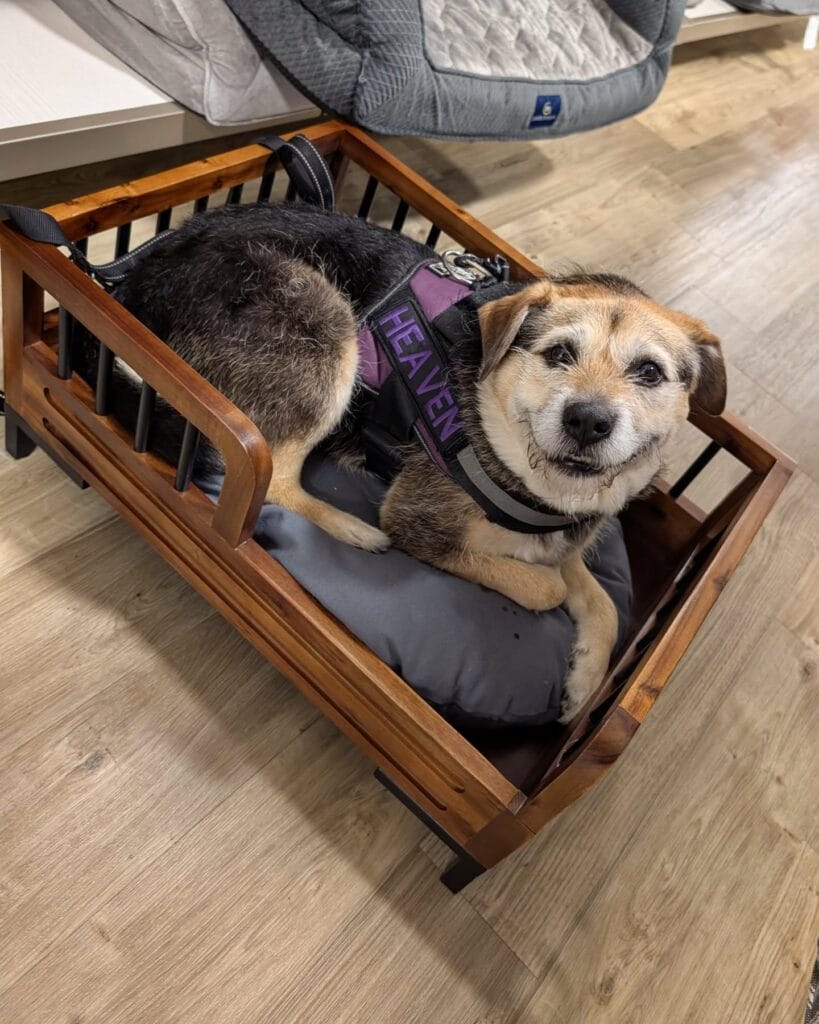 To recreate this, you need a pallet-style wood frame (this one runs roughly 24″ x 36″), black iron rod side rails, and a fitted gray canvas cushion. The harness on the dog reads “HEAVEN” in purple — which, honestly, same.