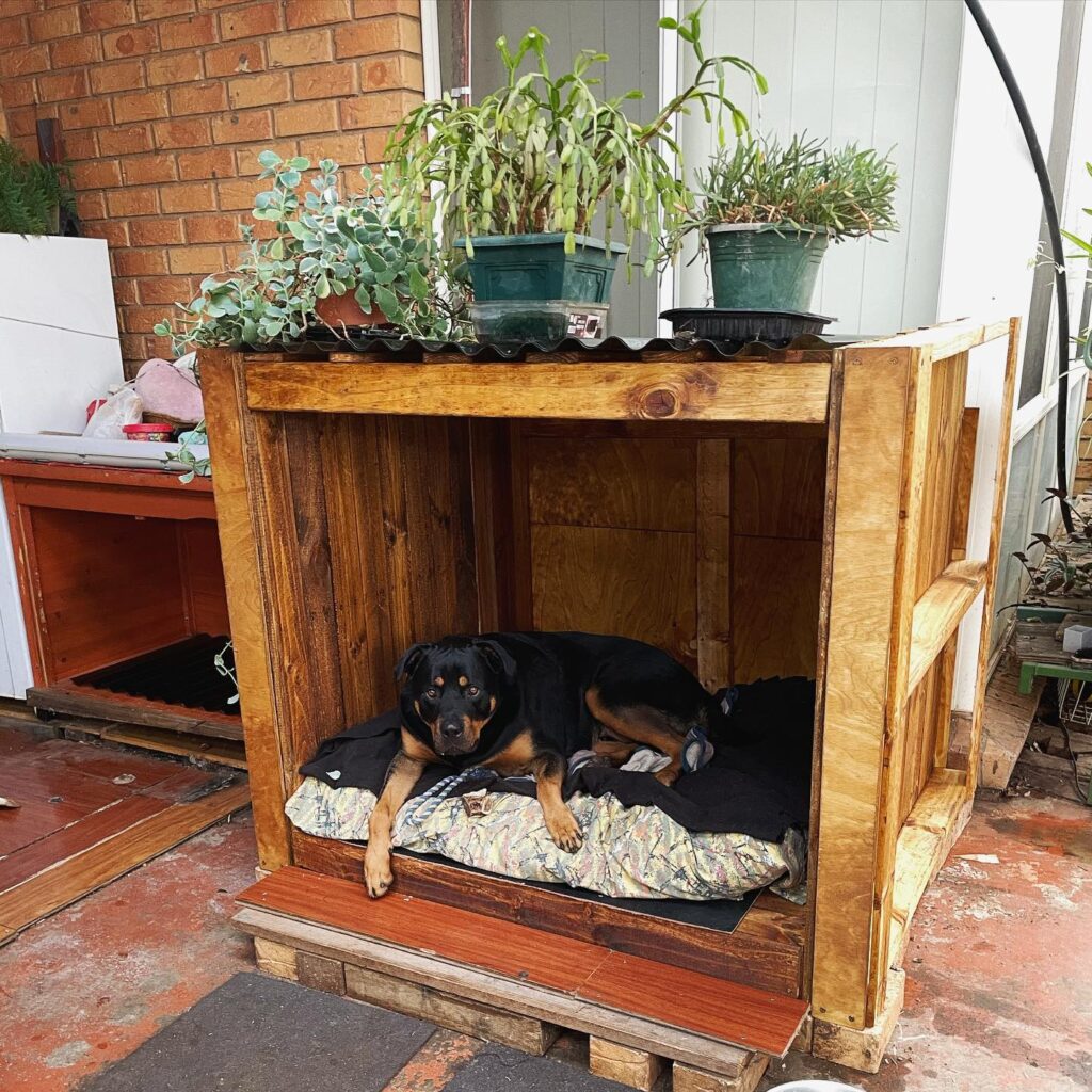 This handbuilt pallet bed uses warm honey-stained wood planks for the sides and back wall, creating a den-like nook a dog will actually choose over your couch. The corrugated metal roofing sheet on top doubles as a planter shelf — so you get trailing succulents and rosemary pots sitting right above your pup’s head. It’s cozy, it’s structured, and it doesn’t look like an afterthought.