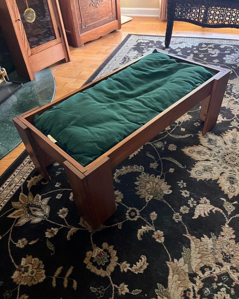#5: The Walnut Bench-Style Pallet Dog Bed with Forest Green Cushion