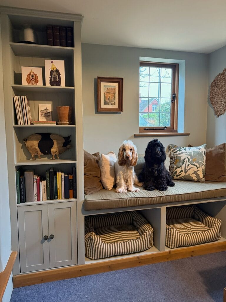 This nook gives off the coziest English countryside energy — sage-painted built-in shelving, a cushioned window bench, and two striped olive-and-cream dog beds tucked right underneath. It’s styled for humans but built for dogs. Honestly, your golden would claim that bench in under four seconds.