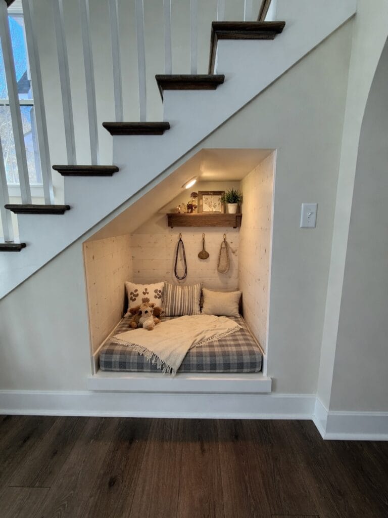 Here’s the trick: add recessed LED puck lighting under the stair stringer above the nook. It creates that warm golden glow that makes the space feel intentional, not like an afterthought.