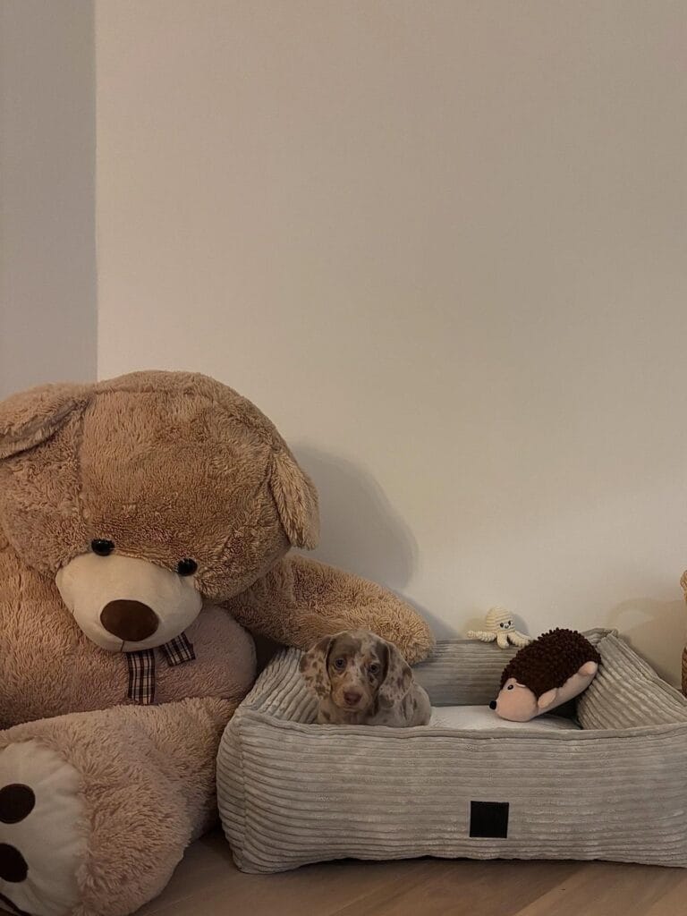 Okay, you have to see this setup because it’s giving cozy corner goals in the best way. A massive plush teddy bear anchors the whole nook, creating this soft, den-like wall that makes the dog bed feel wrapped and protected. And honestly? Your golden retriever would never leave.