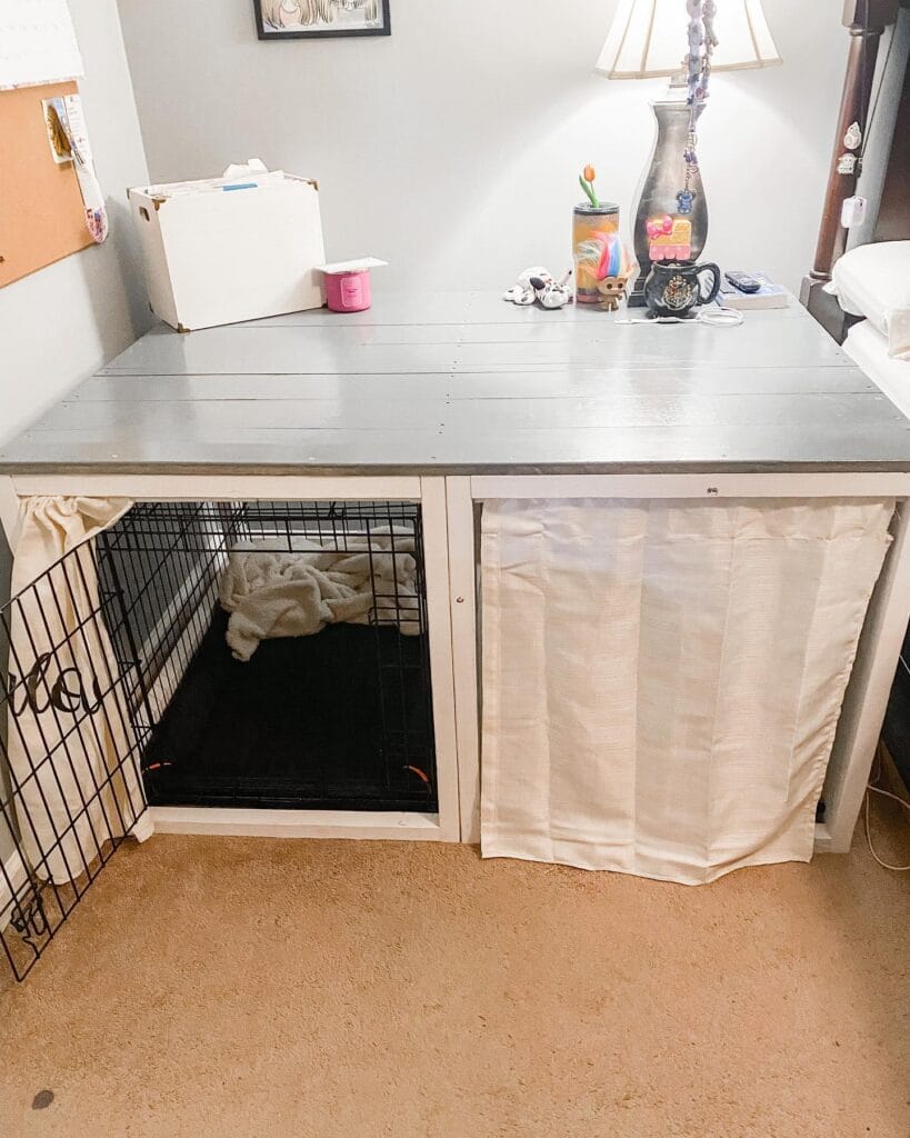 This bedroom nook tucks a wire dog crate right inside a white-painted wood frame unit with a gray-stained plank tabletop — turning dead floor space into a functional surface. Your dog gets a cozy den, and you get extra room for your lamp, your Funko Pops, whatever.
