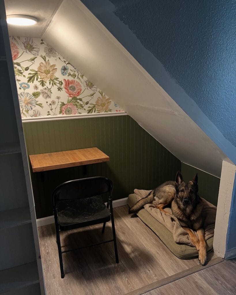 Okay, this one stopped me mid-scroll. Someone took the dead space under their staircase and split it into a mini desk area AND a dog bed nook — side by side. The olive green beadboard wainscoting paired with that floral wallpaper above it feels cozy but put-together, like a space your pup actually wants to curl up in.