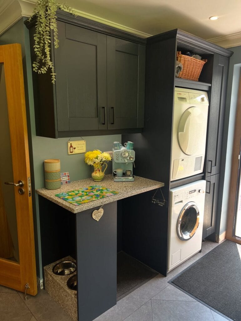 Dark navy shaker-style cabinetry wraps around a granite countertop peninsula with an open cubby underneath — and that’s where the dog zone lives. Two stainless steel bowls sit tucked right into that lower shelf, built into the same granite surface as the counter above. It’s tidy, grounded, and your girl has her own little corner without eating up floor space.