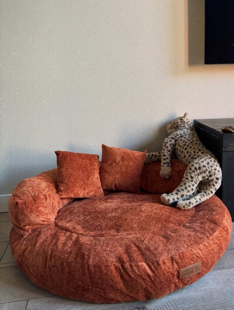 To recreate this, grab a large donut-style pet bed in chenille or bouclé fabric — the texture hides fur beautifully. Add two small toss pillows in the same colorway. A leopard plush toy tucked in makes it feel lived-in and styled without trying too hard.