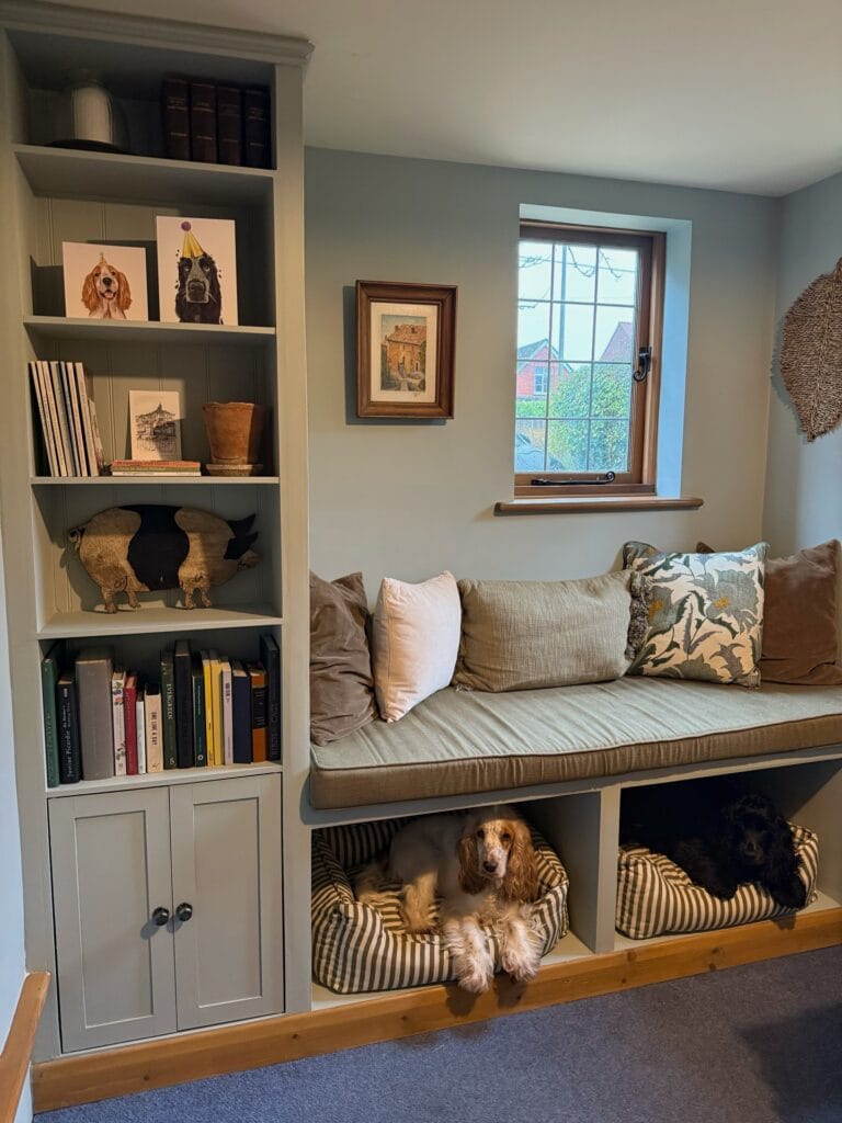 This setup is giving me everything. A cushioned window bench in sage green linen sits above two built-in dog cubbies, each lined with striped cotton dog beds. The whole unit is painted in a soft warm grey (think Farrow & Ball Mole’s Breath territory), with a solid pine base that grounds it beautifully. Two cocker spaniels are literally living their best lives under there, and your golden would absolutely claim one of those spots by day one.