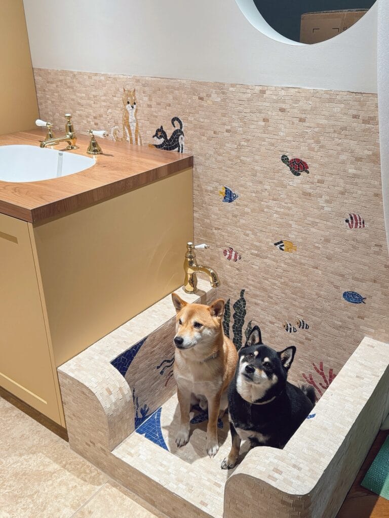 The setup features a low-profile sunken basin with a gold brass handheld faucet mounted at dog height, plus mosaic tile flooring in ocean blue. The walls carry the same small-format travertine tile all the way up, with custom animal artwork — notice the little Shiba Inu portraits near the sink? Chef’s kiss.