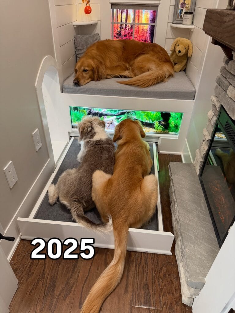 This clever dog nook feels like a miniature lounge built just for pups. A cozy elevated bed sits above a built-in aquarium window, creating a peaceful space where dogs can relax while watching the gentle movement of fish below. The soft lighting and snug design make it feel like a private retreat.