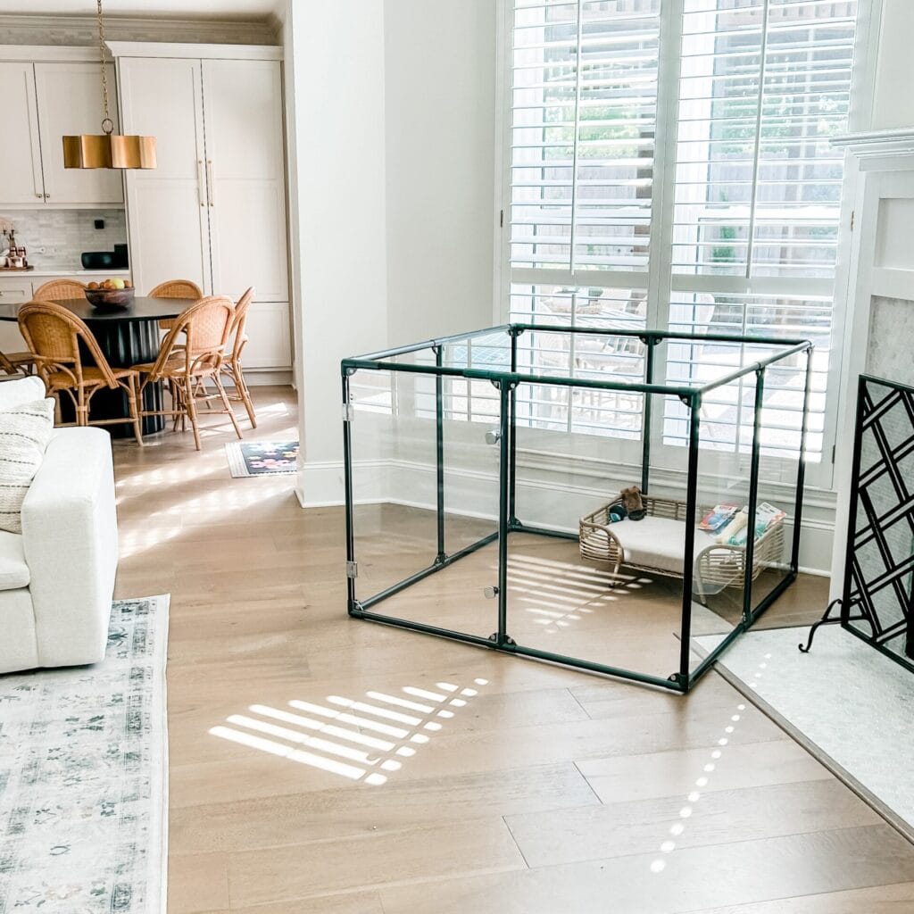 To recreate the setup, use a modular glass or acrylic playpen system with slim dark frames. Place it near windows so the dog can enjoy sunlight and watch the household activity.