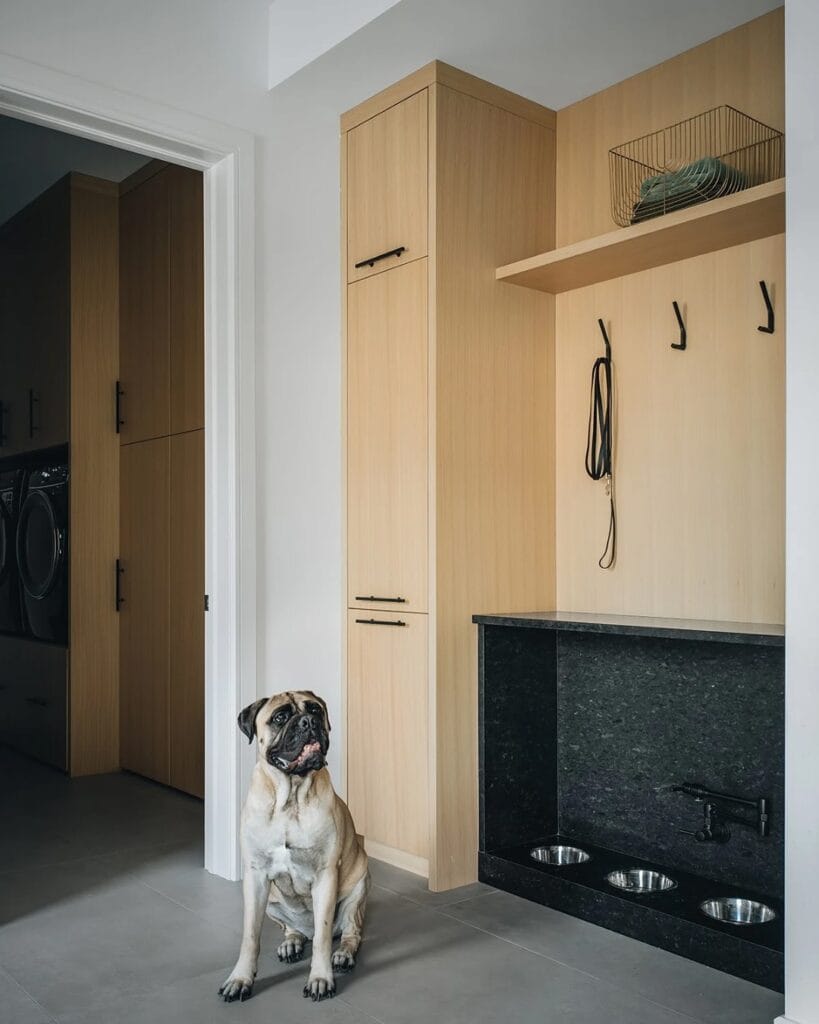 This sleek mudroom design proves that dog spaces can feel just as stylish as the rest of the house. The light wood cabinetry and dark stone feeding station create a modern contrast, while the built-in bowls keep everything tidy and organized. Dogs love the consistency of a dedicated feeding zone.