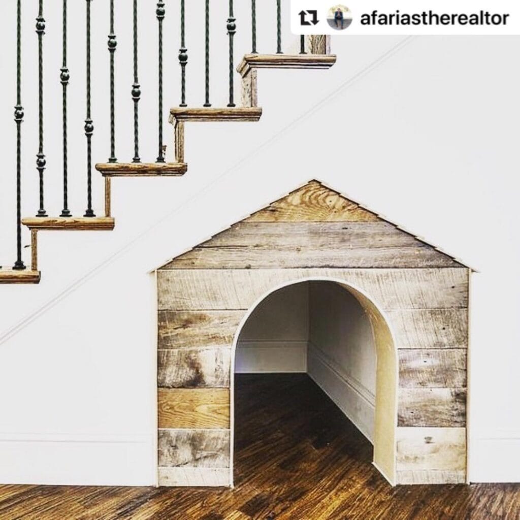 Unused space under the stairs becomes a charming dog hideaway in this rustic design. The wooden structure blends perfectly with the staircase while giving a dog their own quiet retreat tucked into the architecture of the home.