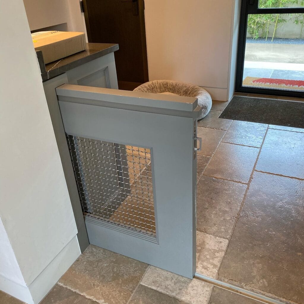 To recreate this style, build a custom half-height wooden gate with wire mesh inserts. Pair it with stone tile flooring and soft neutral cabinetry for a timeless kitchen or mudroom aesthetic.
