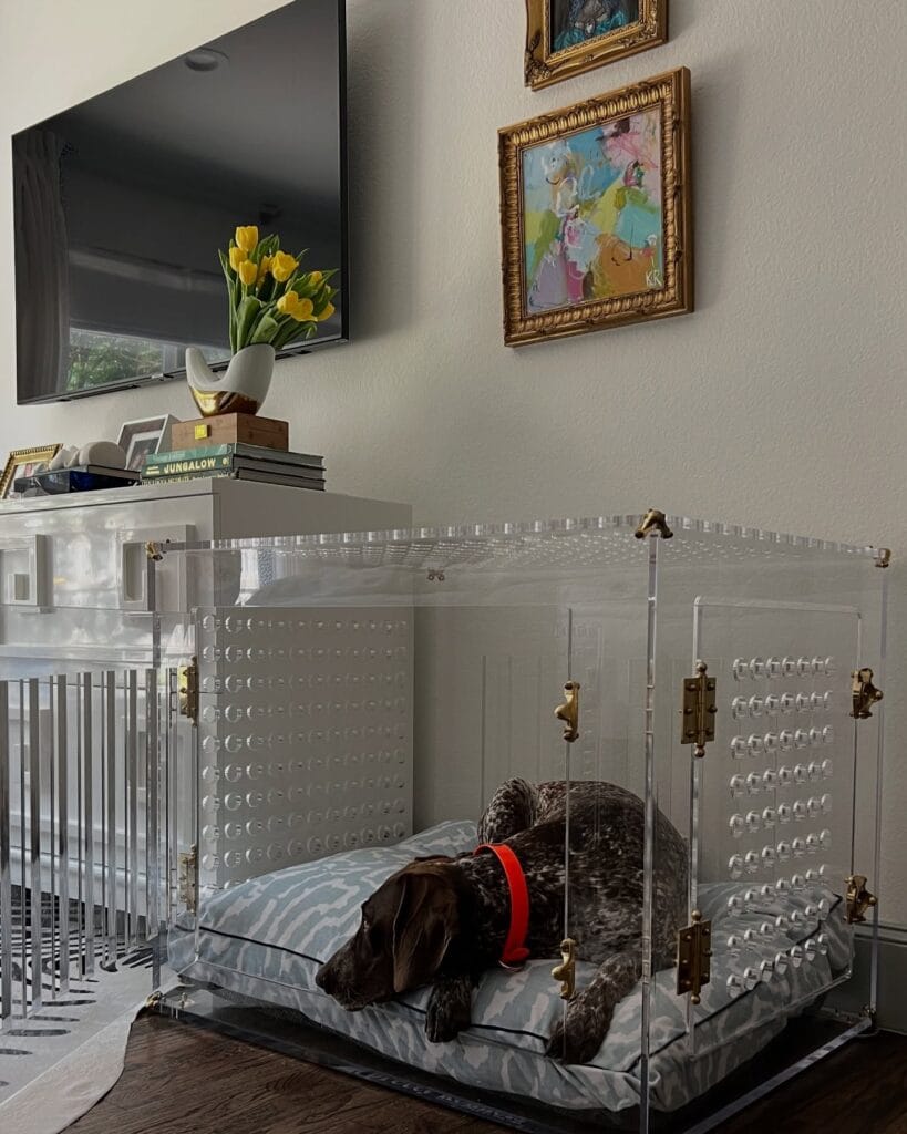 To recreate this look, choose an acrylic dog crate or modular clear panels with brass or metal hardware. Pair it with soft dog cushions and minimal living room decor so the enclosure becomes part of the design.