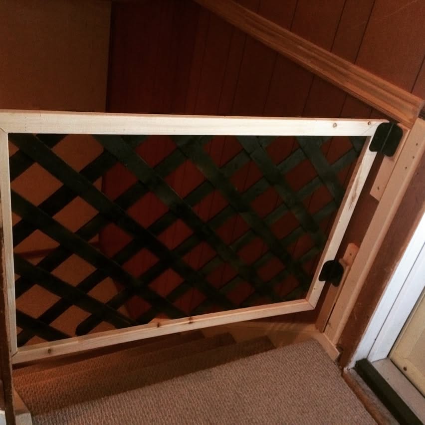 Mount two hinges flush against your stair post. The lattice openings are small enough that Buddy can’t squeeze through, but wide enough that he can see you — which honestly keeps him calmer and less whiny.