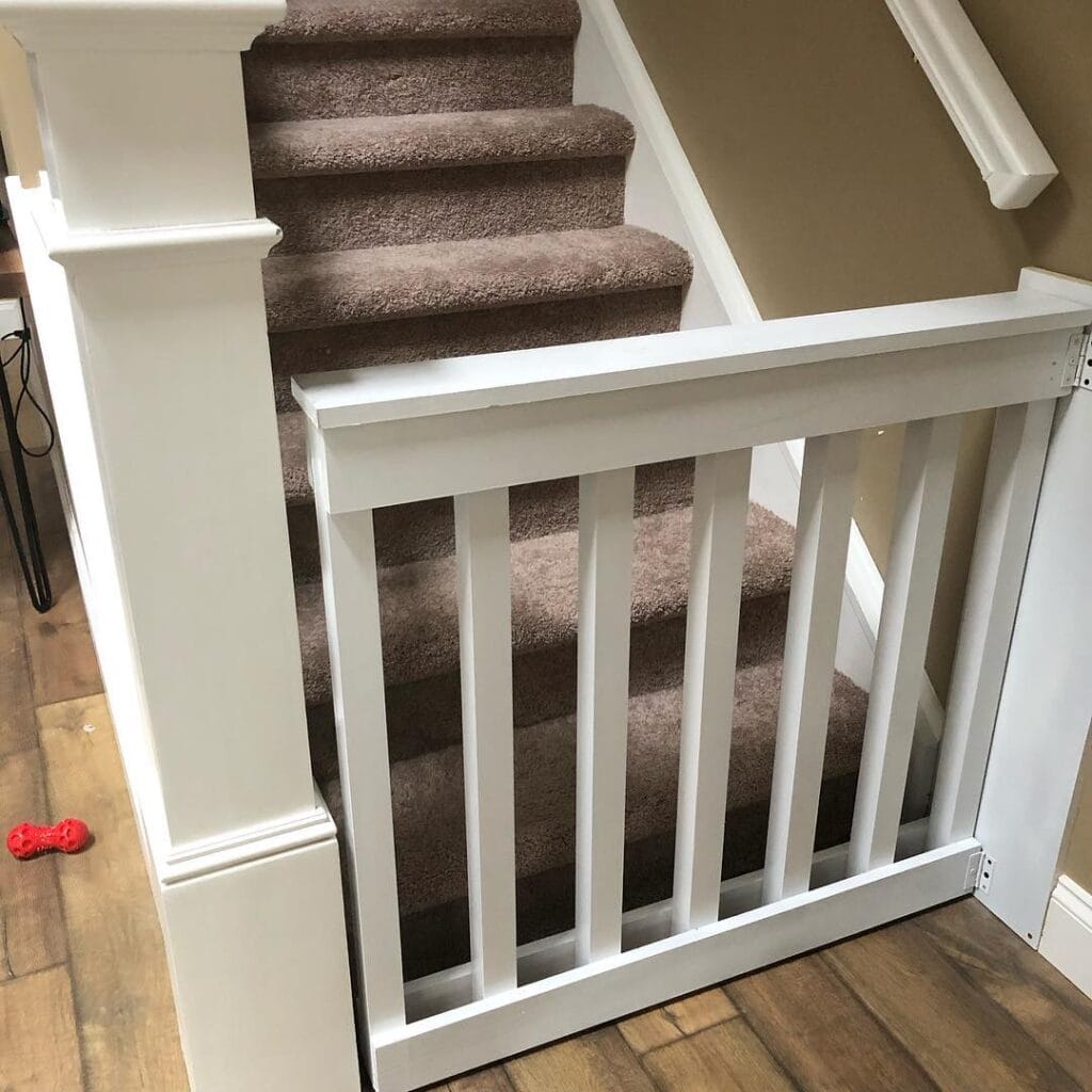 Built-in spindles mean your pup stays safely off the stairs, your staircase looks Pinterest-perfect, and guests never even notice it’s a dog gate.