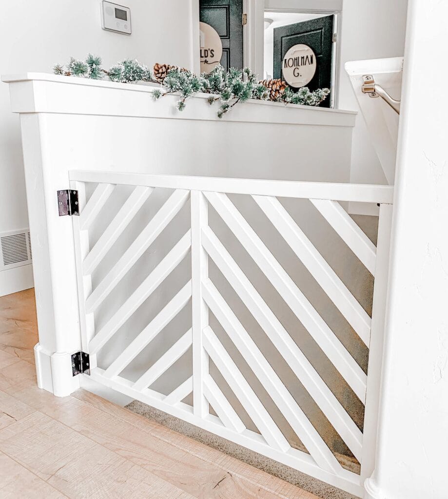 This white wood chevron gate is the one. It’s built into the entryway wall with a top cap rail and swings open on black metal hinges — so you’re not tripping over some plastic accordion thing every morning.