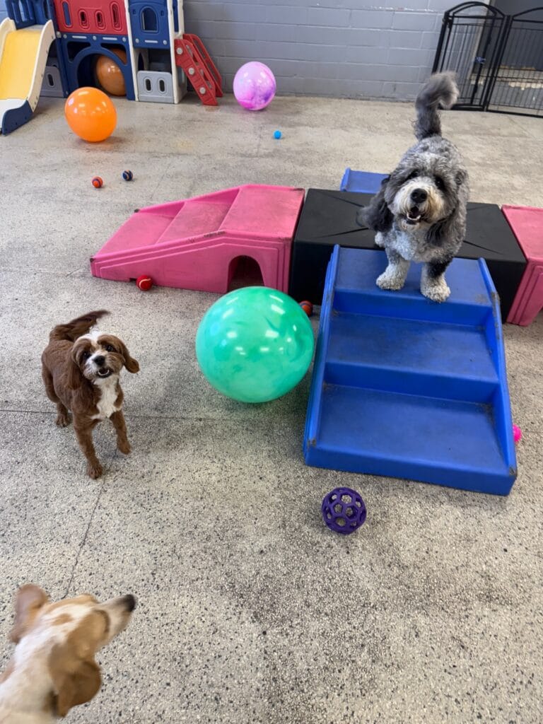 Rotate the balls weekly. Dogs lose interest fast when the toys stay the same, and a bored dog at daycare is a loud dog. The plastic climbing structures in the background — repurposed toddler play sets — are a budget-friendly hack that small breeds go absolutely wild for.