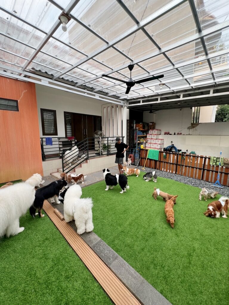 This setup fixes that. It’s a fully covered courtyard boarding space with a polycarbonate roof panels grid held up by a steel frame structure — natural light pours in, rain stays out. Ceiling fans keep the air moving. The artificial turf runs wall to wall in bright green, giving dogs the feel of grass without the mud nightmare.