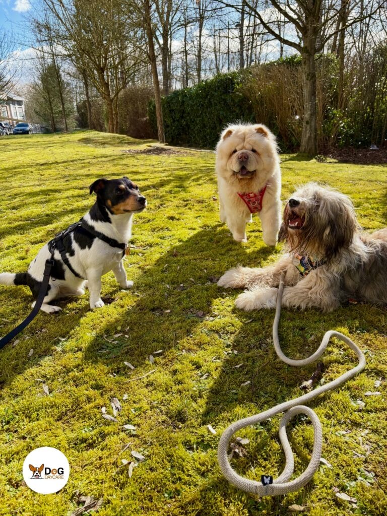 Three dogs — a black-and-white Jack Russell Terrier, a cream Chow Chow in a red harness, and a shaggy Petit Basset Griffon Vendéen — hanging out on a sun-soaked moss-and-grass lawn, surrounded by bare winter trees and trimmed hedges. It’s loose, unstructured, and dog-led. And that matters.