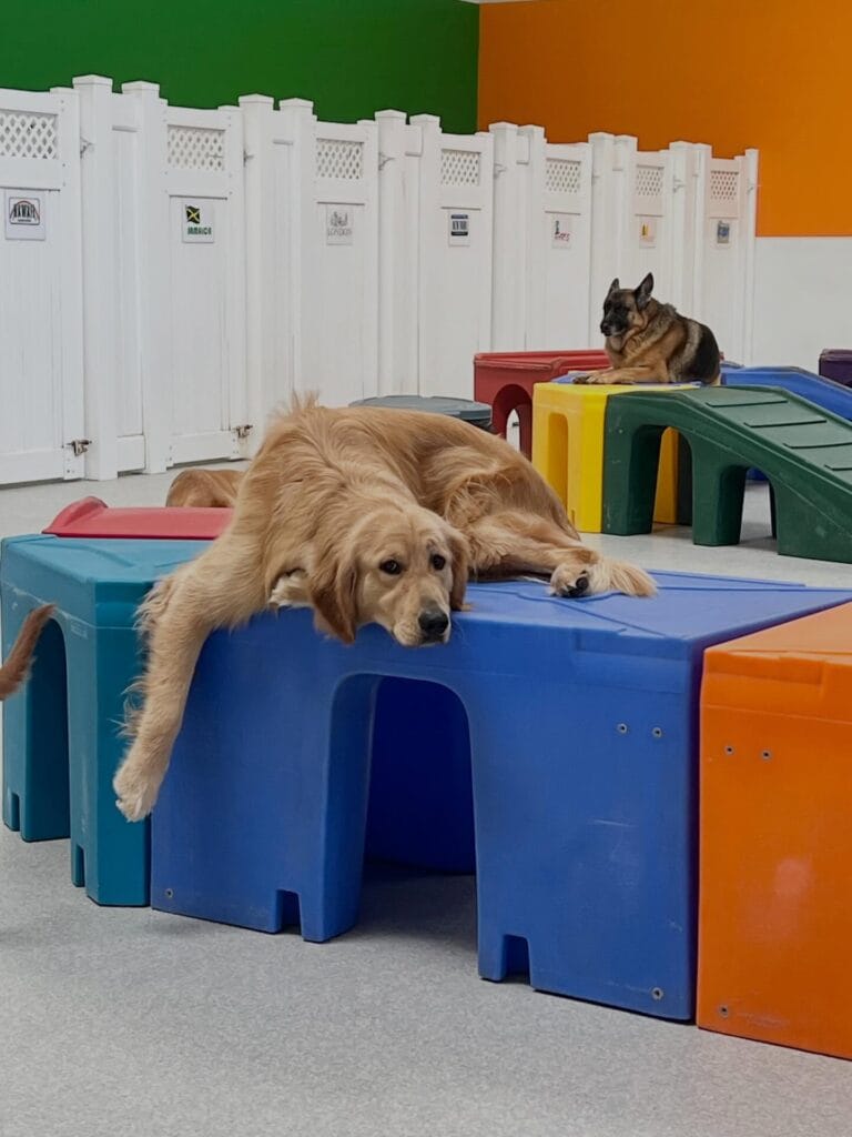The play space at Flying High Pet Resort is stacked with bright primary-colored plastic play structures — think blue, red, yellow, green, and orange modular tunnel platforms arranged across a light gray epoxy floor. A golden retriever is fully sprawled across a blue arch-top play cube, paws dangling, looking like she owns the place. A German Shepherd chills in the back on a yellow platform near a green ramp. The walls pop with bold orange and green paint, and white vinyl picket fencing sections off the space into zones.
