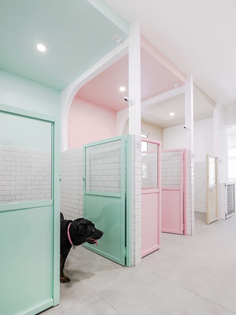 Okay, so picture this — you’re pulling up to drop off your golden, heart already sinking a little, and then you walk into this. Mint green half-doors, blush pink accents, white subway tile lining every wall. It doesn’t feel like a kennel. It feels like a boutique hotel your dog somehow got invited to.