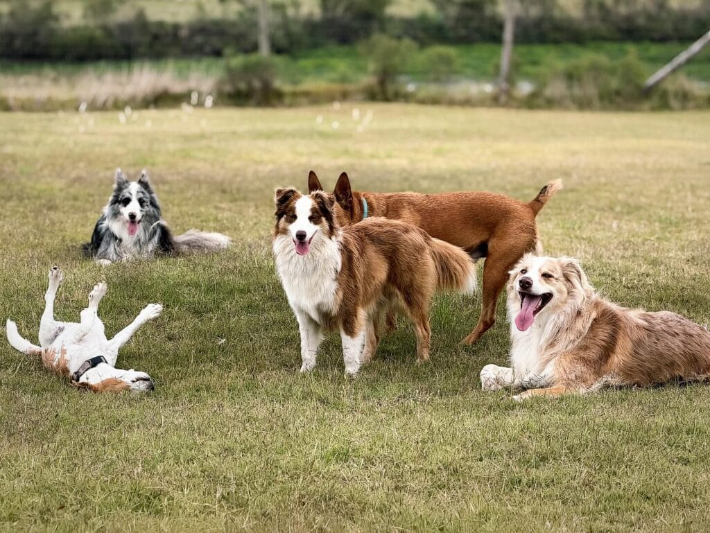 This setup is a wide-open grass field where five dogs are just… living their best lives. One is rolling on his back like he owns the place. Two are standing with their tongues out, fully relaxed. Nobody looks stressed, nobody looks lost. A border collie mix is doing that happy-panting smile thing that gets me every time.