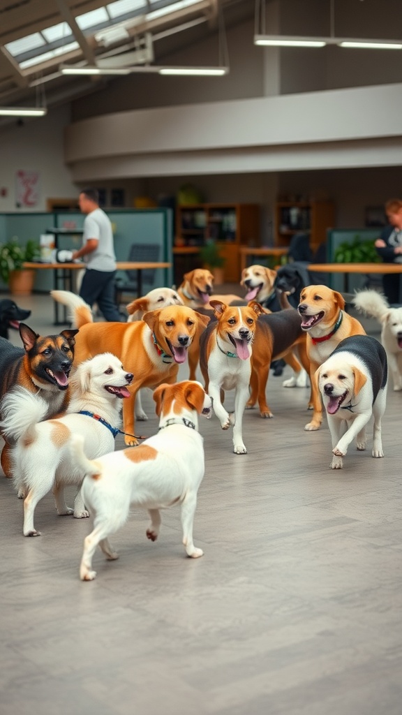 Creating a playful environment in a dog boarding facility can make all the difference. The image showcases a vibrant space filled with colorful walls and fun dog-themed artwork. This kind of décor instantly sets a cheerful mood, making it welcoming for both dogs and their owners. If you’re looking for ways to make your own space more inviting for pets, check out our guide on dog-friendly home ideas.