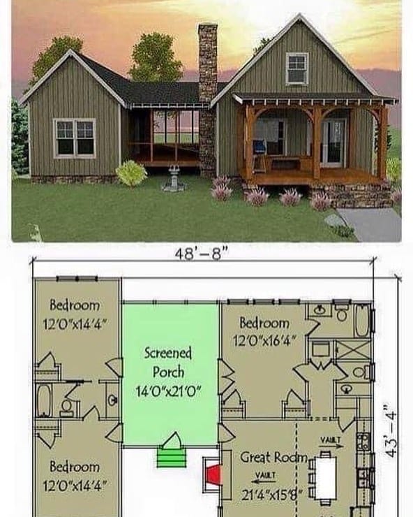 This traditional design separates two 600-square-foot wings with a central breezeway. It becomes your dog’s favorite hangout. The left building has the kitchen and living area. The right wing has two bedrooms. Gray siding pairs with a charcoal metal roof. It extends 8 feet over the breezeway. Rain and sun stay out while breezes flow through. Two stone chimneys anchor each end. They add drama that makes neighbors stop during walks to take photos.