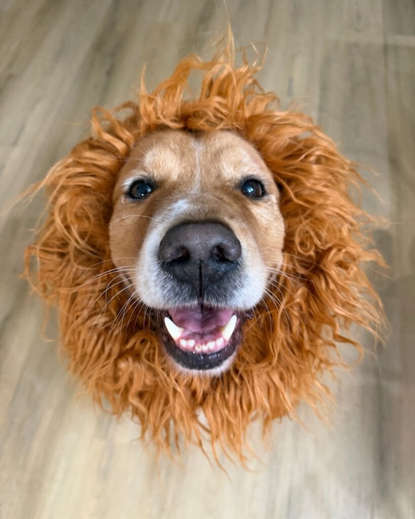 Okay, so picture this — your golden is sitting right in front of you, looking up with that big goofy smile, and suddenly she looks like she escaped from the Serengeti. That’s exactly the energy this lion mane costume brings.