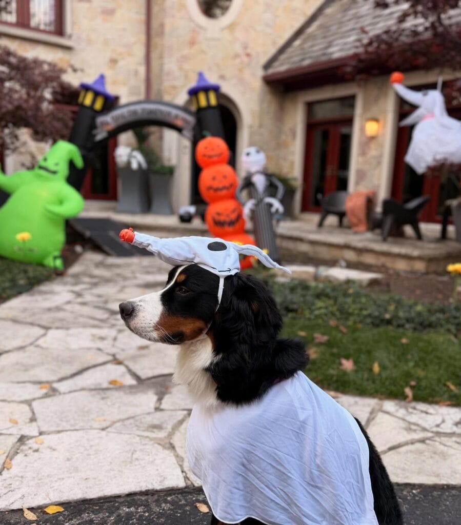 This costume is giving full “Zero the Ghost Dog” energy — you know, Jack Skellington’s loyal pup from The Nightmare Before Christmas. The white fabric cape drapes over the dog’s body, and the headpiece shaped like Zero’s floppy ghost ears sits right between the ears with a tiny red glowing nose detail at the tip. It’s exactly the kind of look that makes strangers stop mid-stride to grab their phones.