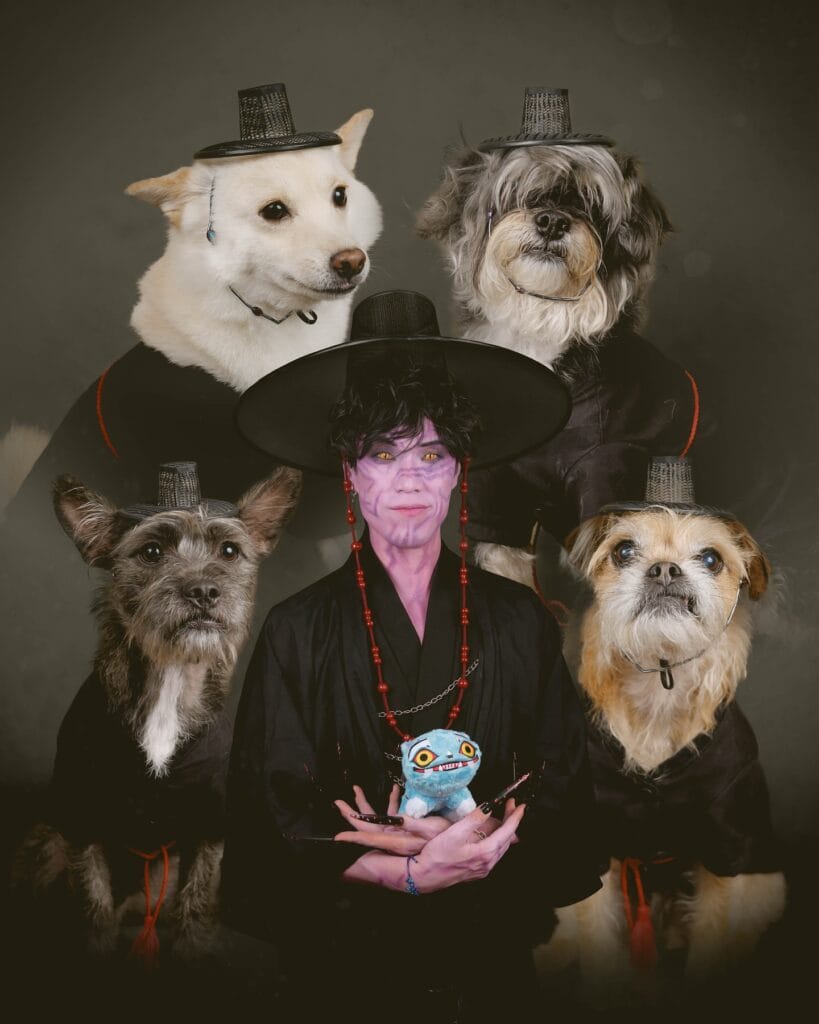 This is a full-cast costume concept — one human dressed as a Gumiho (a Korean nine-tailed fox demon) surrounded by four dogs all wearing matching black joseon-era robes with red trim detail and miniature gat hats (traditional Korean wide-brimmed black hats). The cohesion here is chef’s kiss.