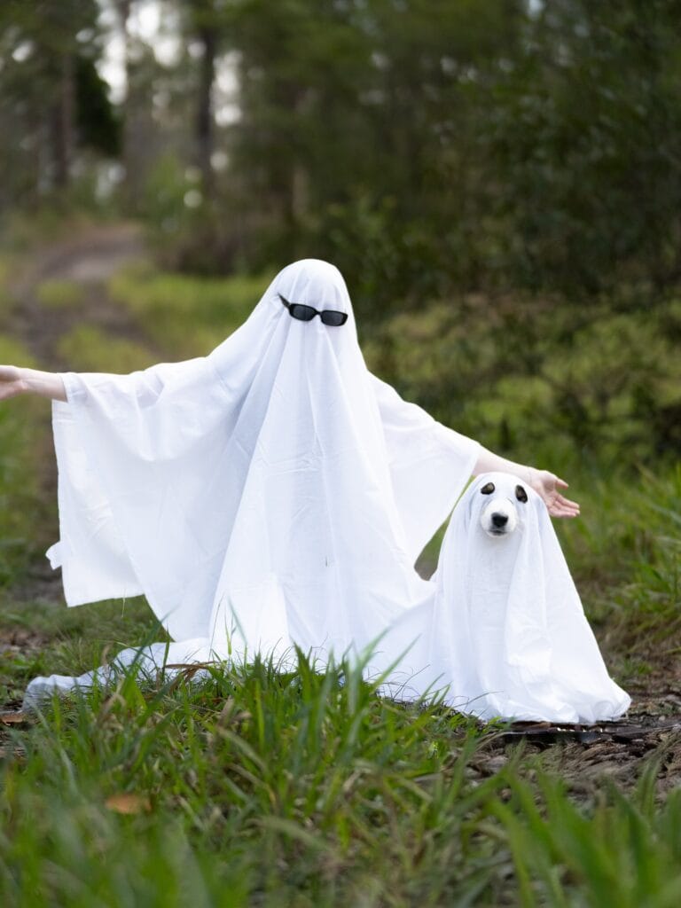 This look is pure nostalgia — a white fitted bedsheet draped over your dog with a head hole cut just wide enough for their snout and ears to peek through. The human version gets black wraparound sunglasses tucked into the fabric for that extra “cool ghost” energy. Together? Absolutely unhinged in the best way.