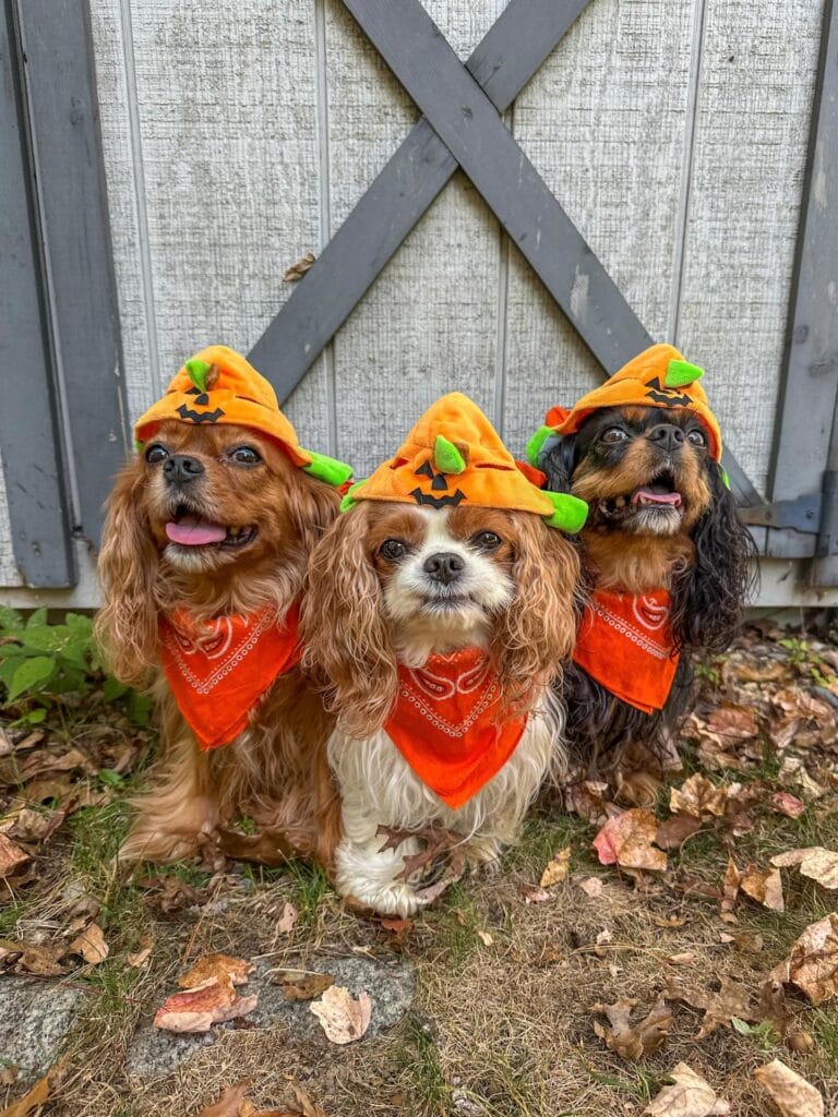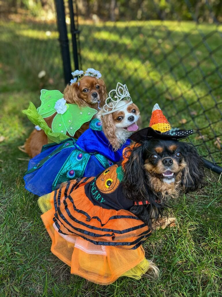 Okay, stop everything — because this photo might be the most coordinated dog Halloween moment I’ve ever seen. Three Cavalier King Charles Spaniels sitting together in full costume, each one with a completely different look, and somehow they’re all perfectly matching the Halloween energy. The textures alone — tulle, sequins, iridescent fabric — make this feel like a pet costume parade worthy of your Pinterest board.