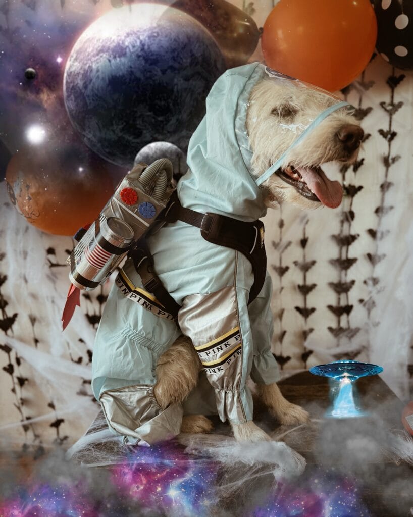 Your golden is already chaos in a fur coat — so why not make it official and send her to space?