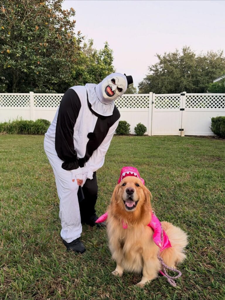 Your golden is sitting there, tail going a mile a minute, tongue out, zero concern about the terrifying clown next to her — and honestly? She’s the star of the whole photo.