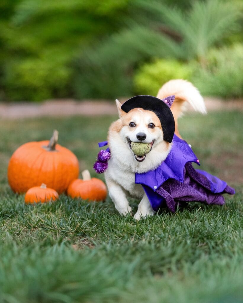 Okay, this one. This is the costume I sent to my cousin last Halloween with zero context and just three exclamation points. A Pembroke Welsh Corgi running full-speed through the grass, tennis ball in mouth, wearing a deep purple satin dress with a black felt witch hat — and somehow looking like the happiest creature alive.