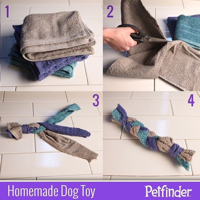 Cut each towel into 3 long strips, roughly 2–3 inches wide. Gather all 9 strips into three groups of three. Braid each group tightly until you have three separate braided sections. Then braid those three sections together into one thick rope. Knot both ends hard — double-knot them. Tuck loose ends inside the knot so nothing unravels mid-tug.
