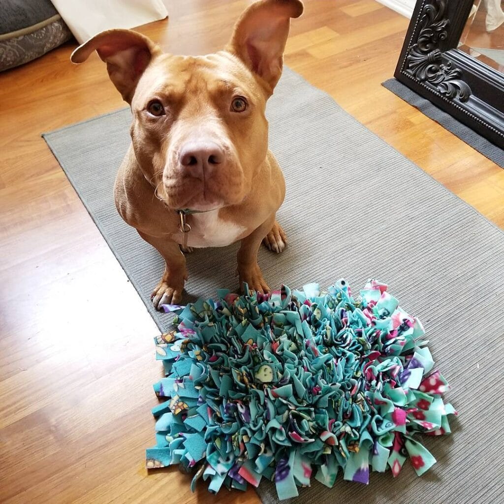 Mix patterned and solid fleece strips — it makes the mat visually dense, which hides kibble better and keeps your dog rooting around longer.