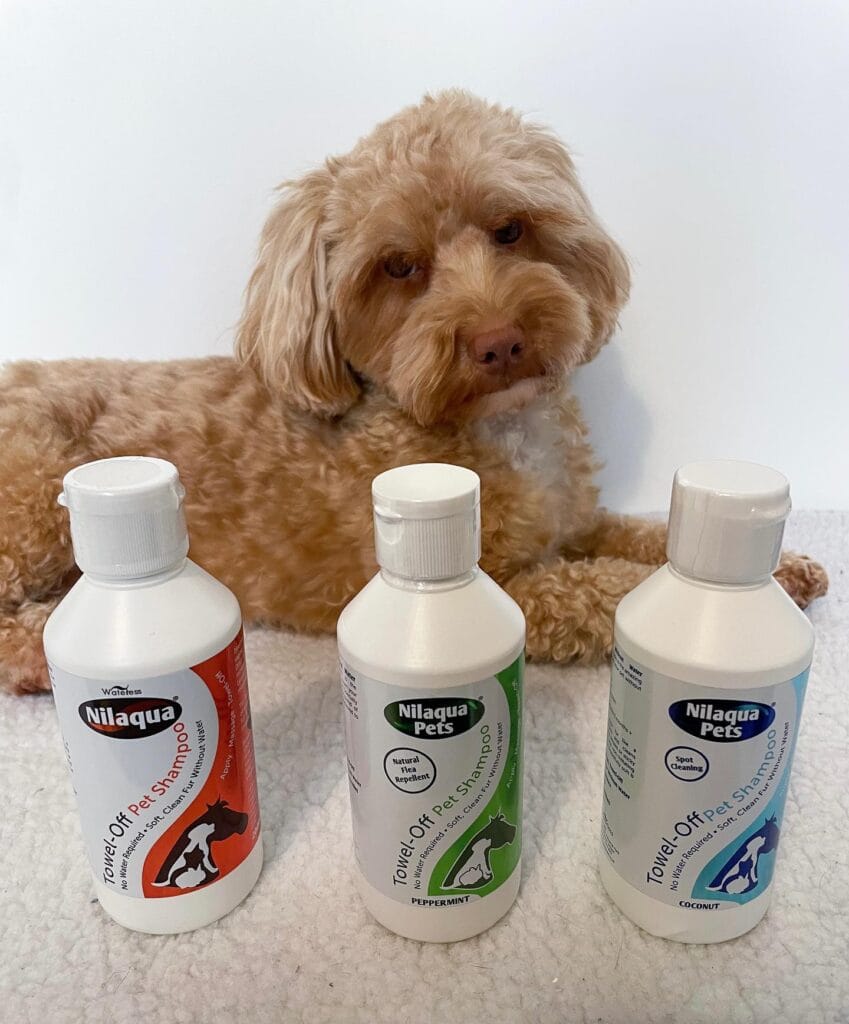 And here’s what I love — this comes in three versions. The red Nilaqua Waterless Pet Shampoo for everyday freshness. The green Peppermint formula, which doubles as a natural flea repellent. And the blue Coconut Towel-Off Shampoo, designed for spot cleaning those specific trouble zones (hello, muddy paws and drool chin).