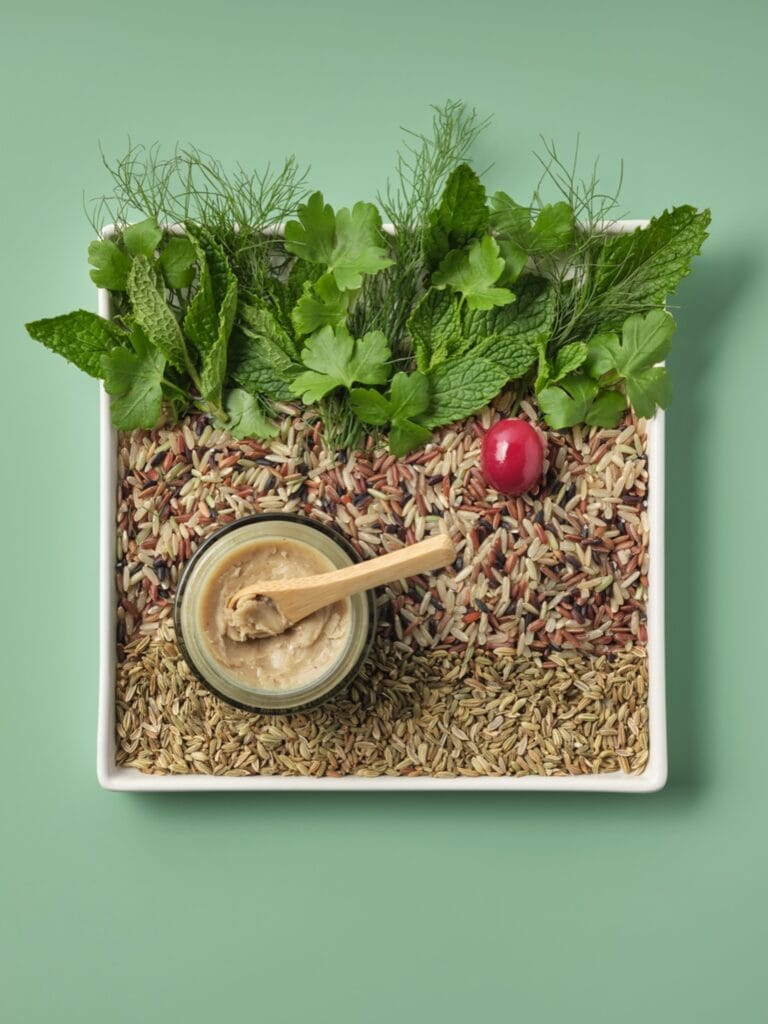 This paste uses fennel seeds, mixed wild rice, fresh mint, parsley, dill, and a creamy tahini base — all visible in that gorgeous flat-lay. The fennel does the heavy lifting here: it neutralizes odor at the source, freshens breath naturally, and the payoff is a dog who doesn’t clear the room anymore.
