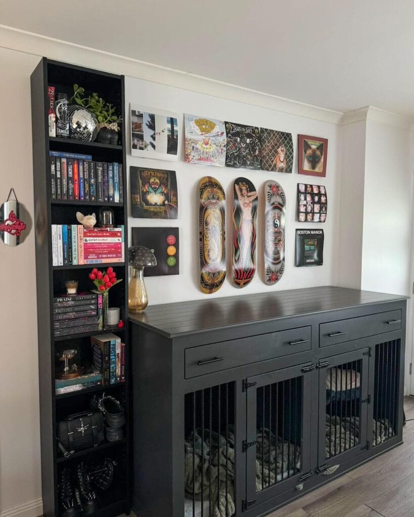 #4: Skateboard Deck Gallery Wall With Built-In Dog Crate Console