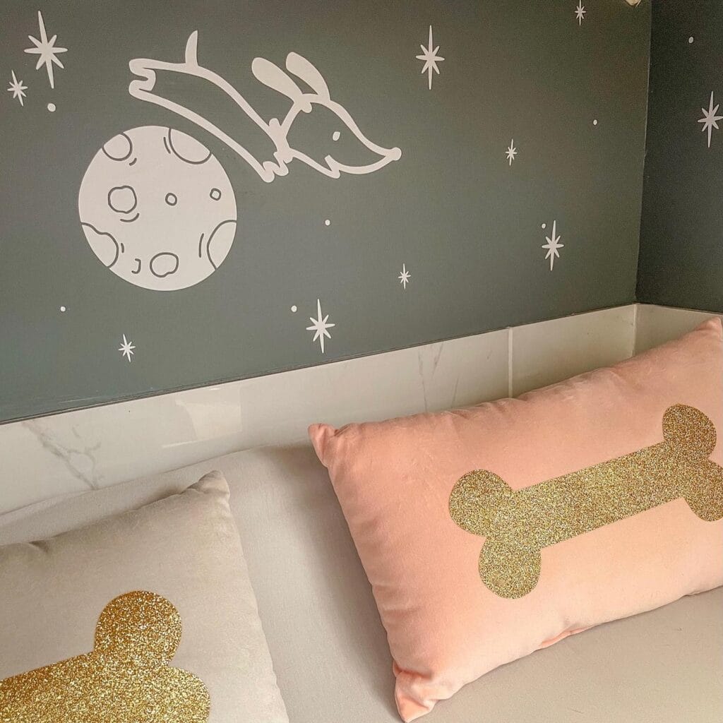 #14: Space-Themed Dog Crate Nook with Bunny Mural and Glitter Bone Pillows
