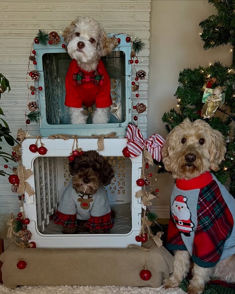 This setup? It’s two white plastic modular crates stacked vertically, decorated with red berry garland, burlap ribbon bows, and pine cone string lights. Each pup gets their own level, dressed in matching Christmas outfits. The whole thing sits against a white brick fireplace wall next to a lit Christmas tree.