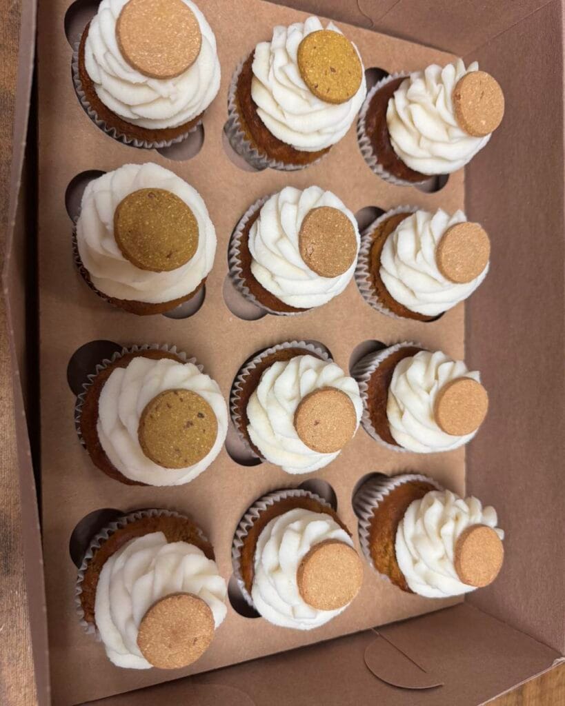 Looking at this box, I’m obsessed with how polished they are. Each cupcake sits in a silver foil liner, topped with swirled white cream cheese frosting and crowned with a round snickerdoodle-style cookie disc — golden, slightly speckled, about 1.5 inches in diameter. The cake base is a warm amber-brown, which tells me there’s cinnamon and chai spice baked right in. No artificial dyes. No chocolate. Just warm, dog-safe ingredients that smell like your favorite fall candle.