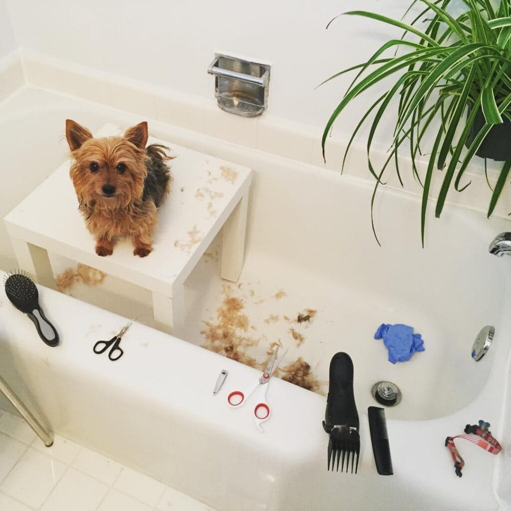Look at this adorable little terrier perched bravely on a white step stool placed directly inside the bathtub! It is certainly a clever hack for mess containment, identifiable by the clumps of golden-brown fur scattered across the white porcelain surfaces and the spider plant watching from above. The groomer has neatly arranged their arsenal—scissors, a pin brush, and a comb—along the tub’s edge for easy access. However, while this innovative DIY setup keeps the flying hair confined within the splash zone, leaning over a bathtub rim can wreak havoc on your spine during a detailed grooming session.