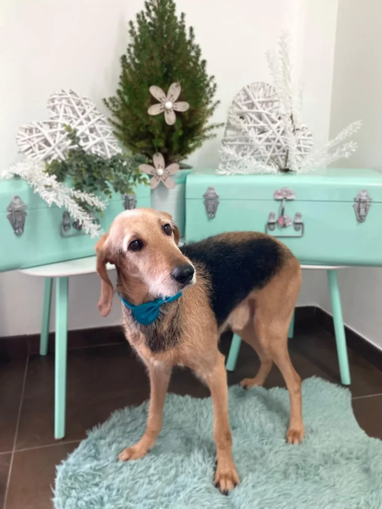 Take a look at this distinguished gentleman! He is posing confidently on a plush, mint-green rug that perfectly coordinates with the retro trunks and side tables behind him. Implementing a Pastel Monochromatic Photo Corner like this is a brilliant way to visually market your services. Notice how this salon utilized vintage-style suitcases, white wicker hearts, and a miniature evergreen tree to create a cohesive, seasonal vignette without overwhelming the subject. The pup’s matching teal bowtie ties the whole look together, turning a standard fresh haircut into a viral-worthy moment.